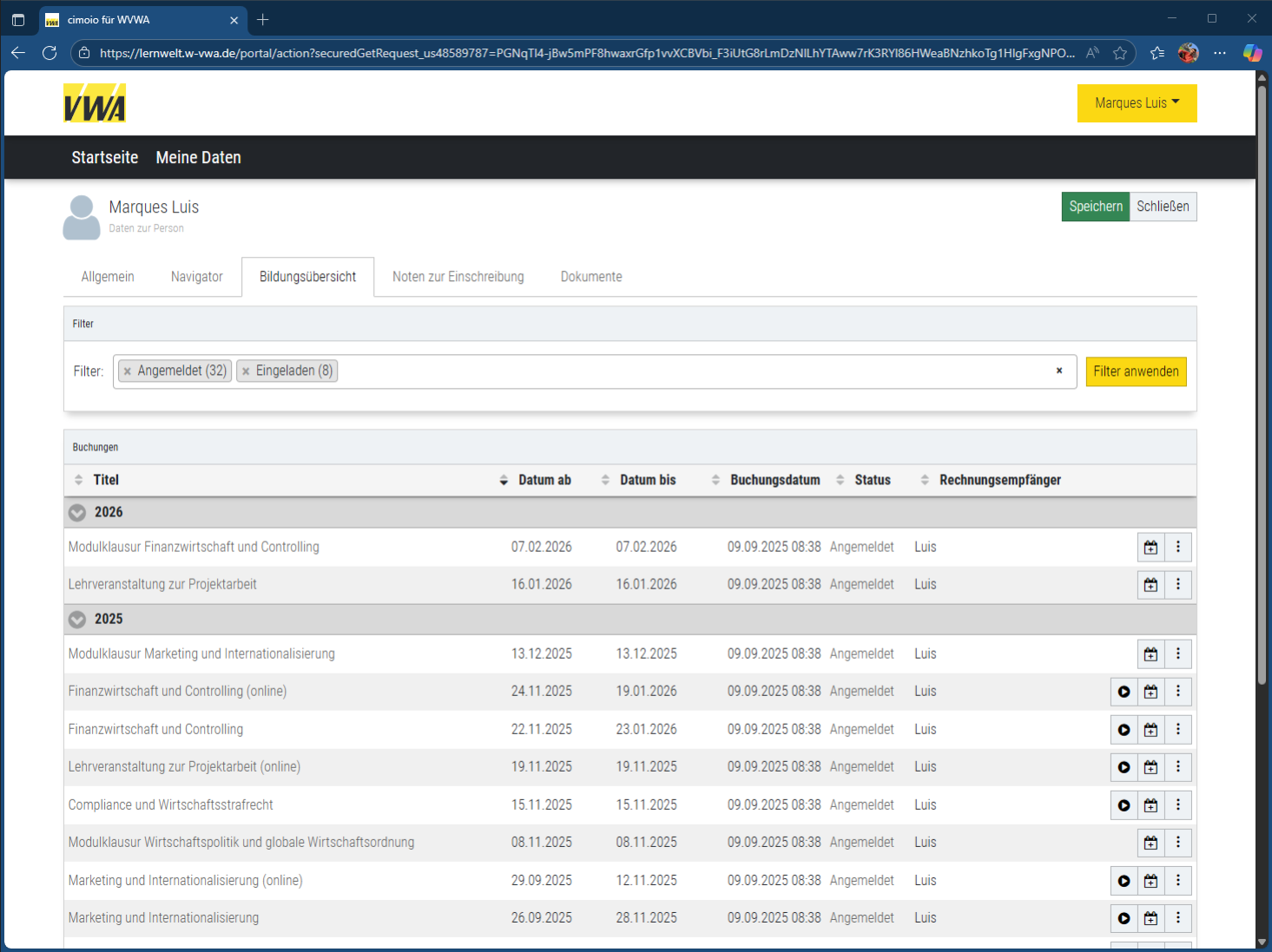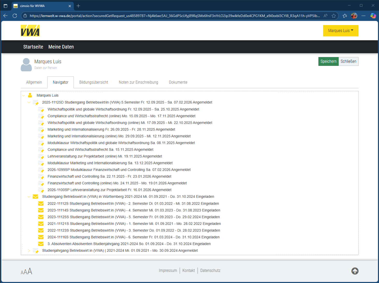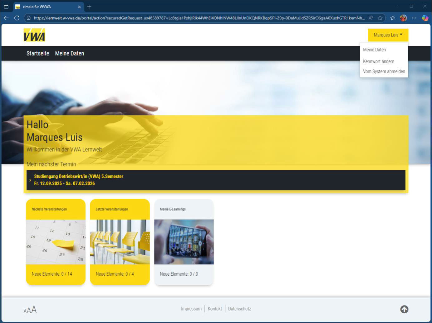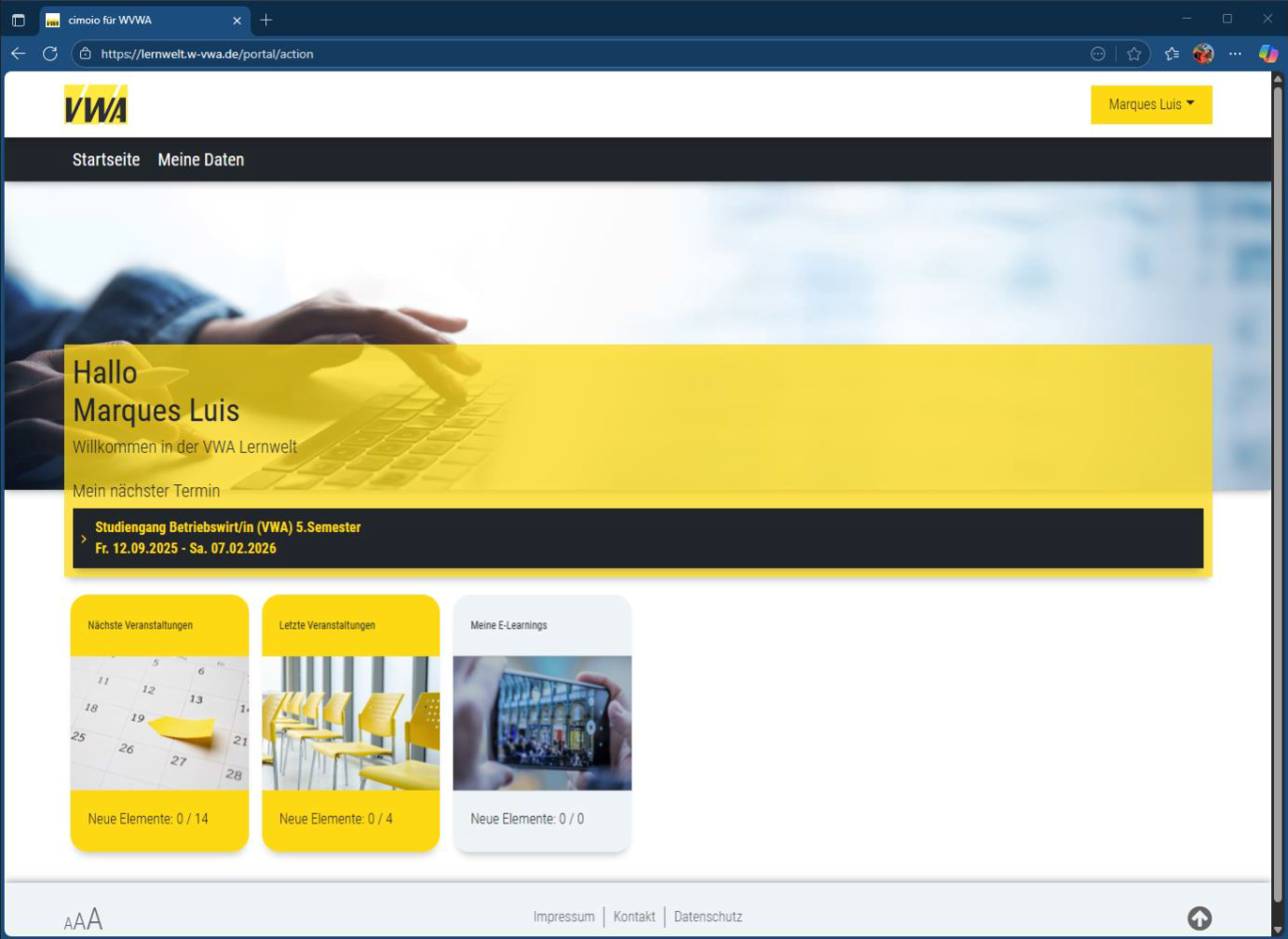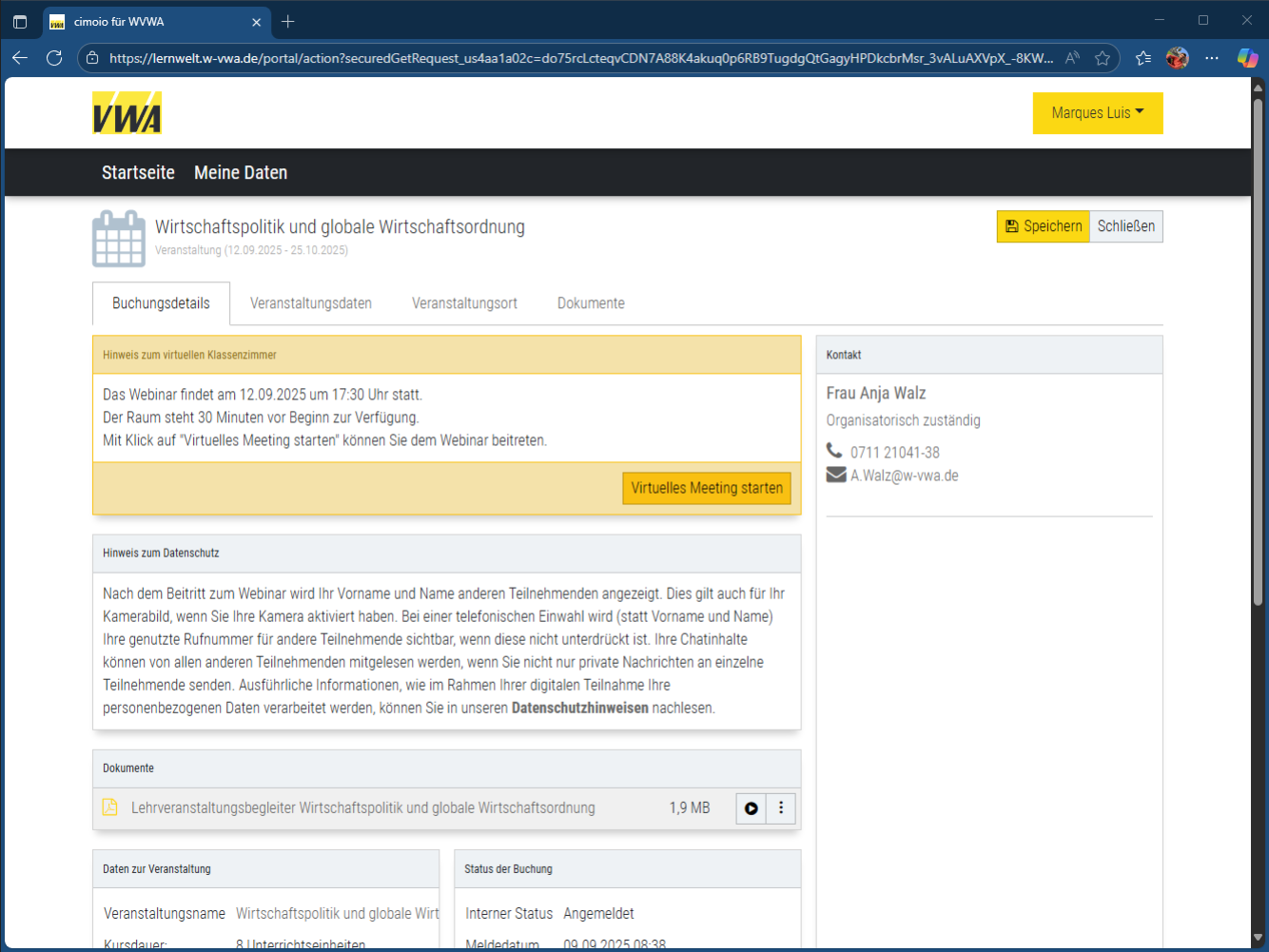 Seitens des Teilnehmenden können hier die Anrede, die privaten Telekommunikationsdaten sowie die Bankverbindung geändert werden. Darüber hinaus wendest du dich bitte direkt an deinen zuständigen VWA-Ansprechpartner.